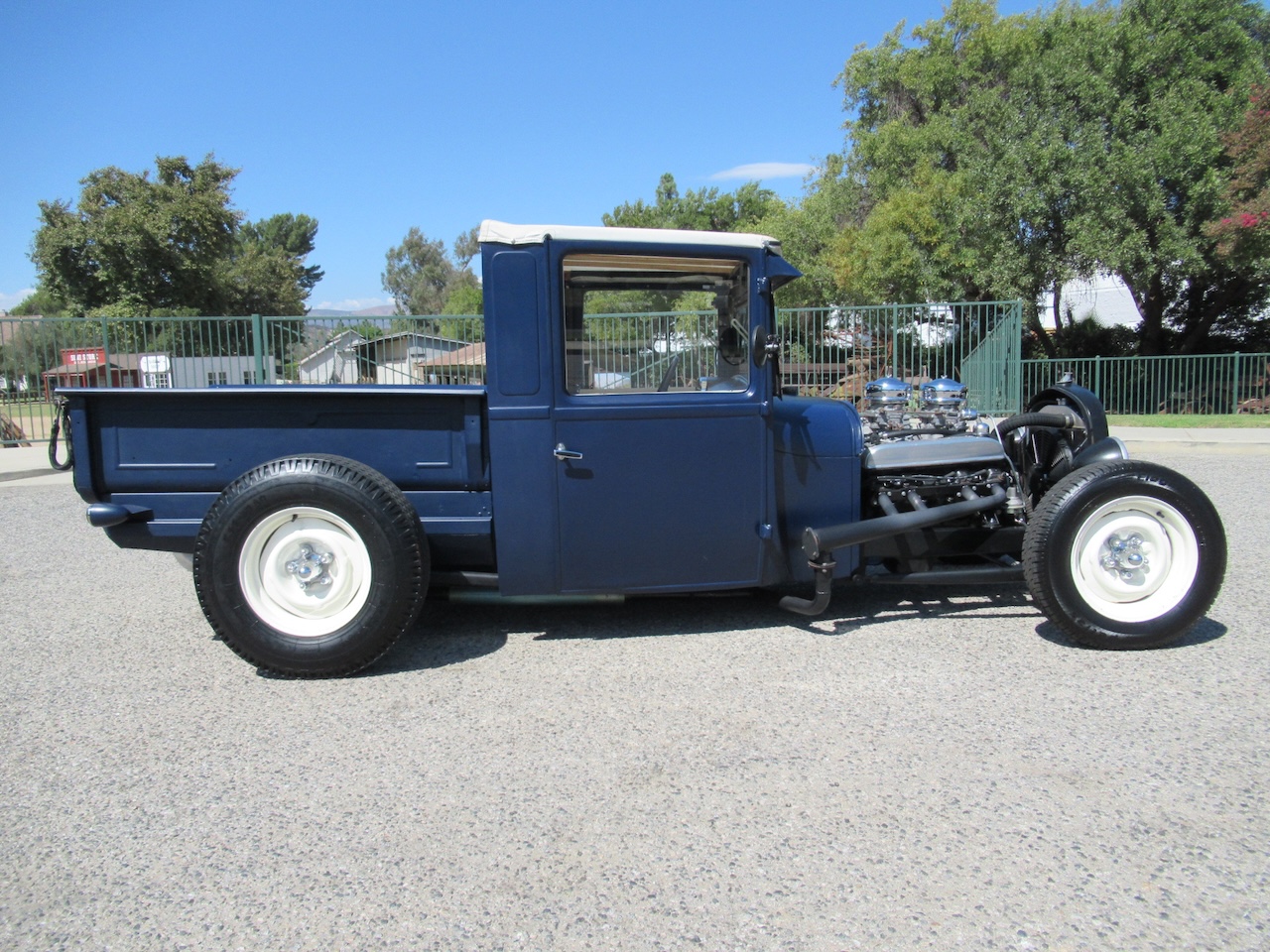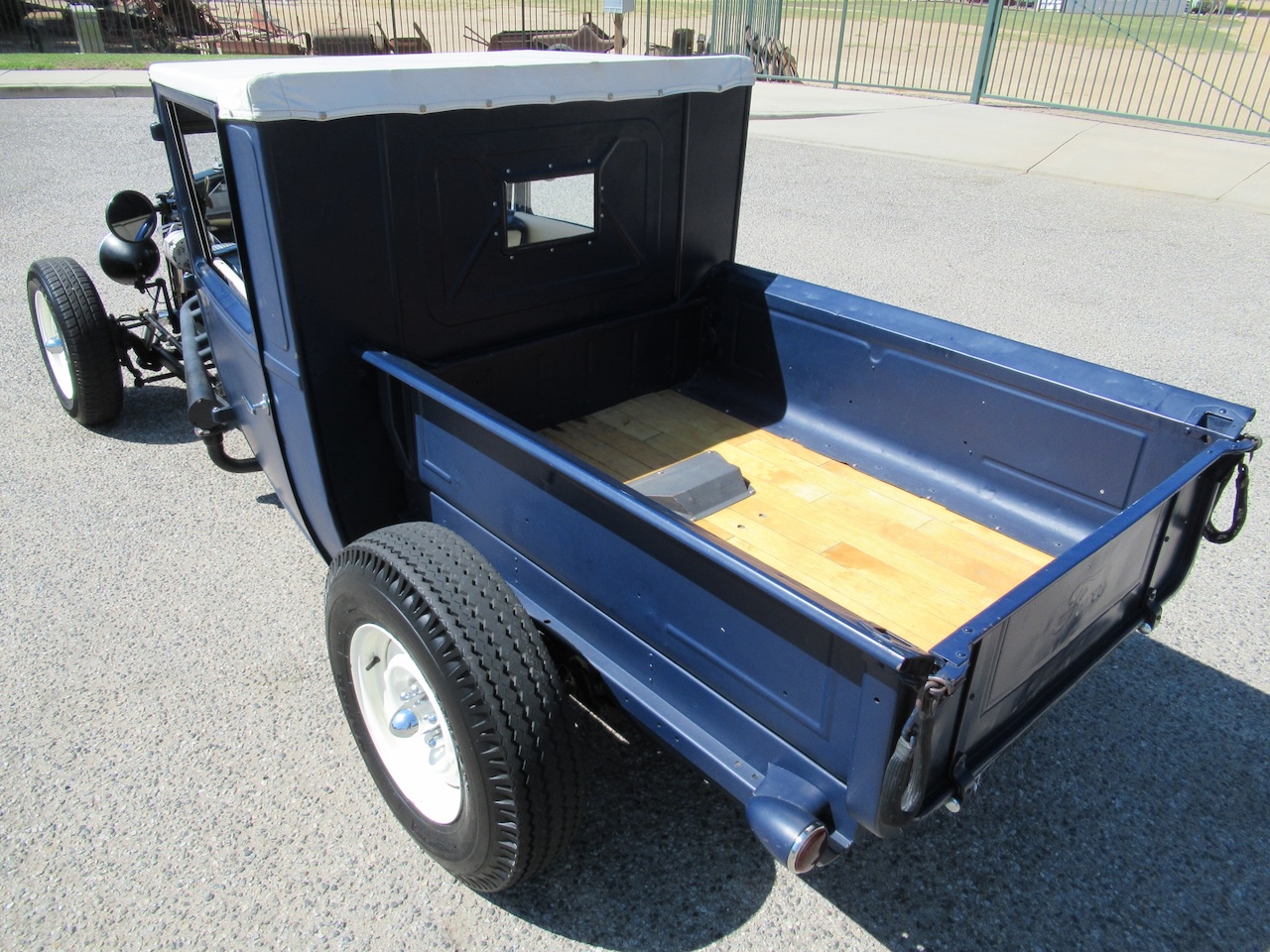 You probably won’t see another one like it! This Model A Pickup is exactly what guys used to build in the 50’s and 60’s. Painted in a Matte Blue finish with all of its bumps and bruises still there, Big Ford headlights, a wood bed with relocated Barrel style fuel tank under it, battery access panel and a little added clearance for the rear differential. The 15 inch skinny steel wheels are painted a cream color with Chrome center caps and a wood framed ratty canvas soft top to let the light in. The exposed powerplant is a 401 Buick Nailhead V8 with an Offenhauser aluminum dual quad intake with a couple of Carter AFB 4 barrels on top, Chrome dome air cleaners, Finned aluminum Offenhauser valve covers, aluminum radiator with overflow catch can, electric fan, Lake style headers with block off plates and a set of Smithy tube mufflers with turn downs. The Turbo 400 transmission shifts properly and is followed by a 57 Chevy rear differential with some freeway friendly gears. The interior is finished in White vinyl with Blue piping, Custom 1958 Rambler dash board, Early Ford style steering wheel, Moon Eyes tachometer, Lokar Floor shifter, glovebox mounted AM/FM CD stereo with Aux and USB, pop out tilt windshield, electric wiper and dual hinge mounted mirrors. The suspension consist of 36 Ford Rear radius rods, custom fabbed frame with 10 inch kickup, a dropped A front axle with split A radius rods and some front disc brakes to stop this crazy contraption. This car was built to drive and turns a lot of heads but if you are over 5 foot 8 inches you won’t fit, no legroom in this one!