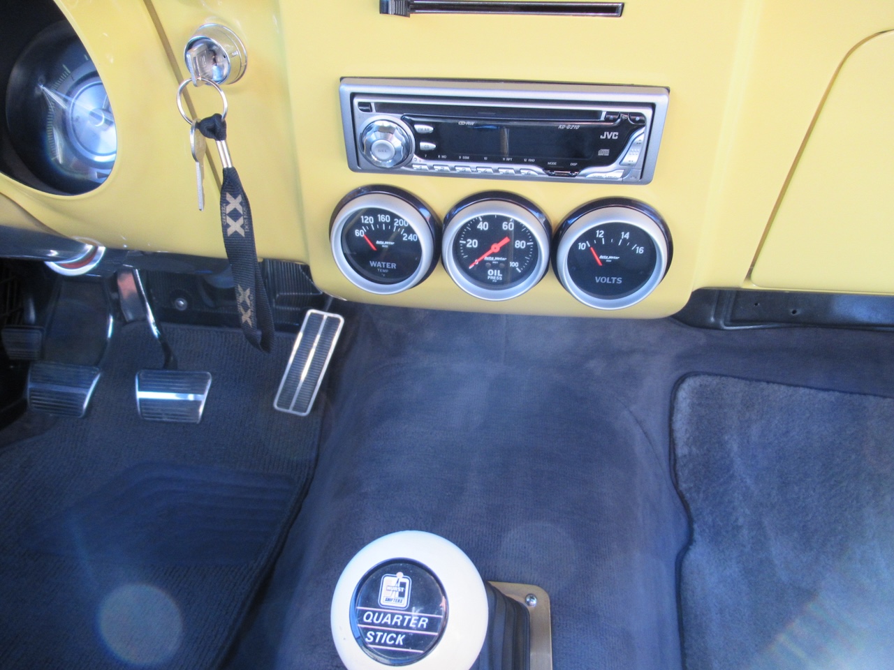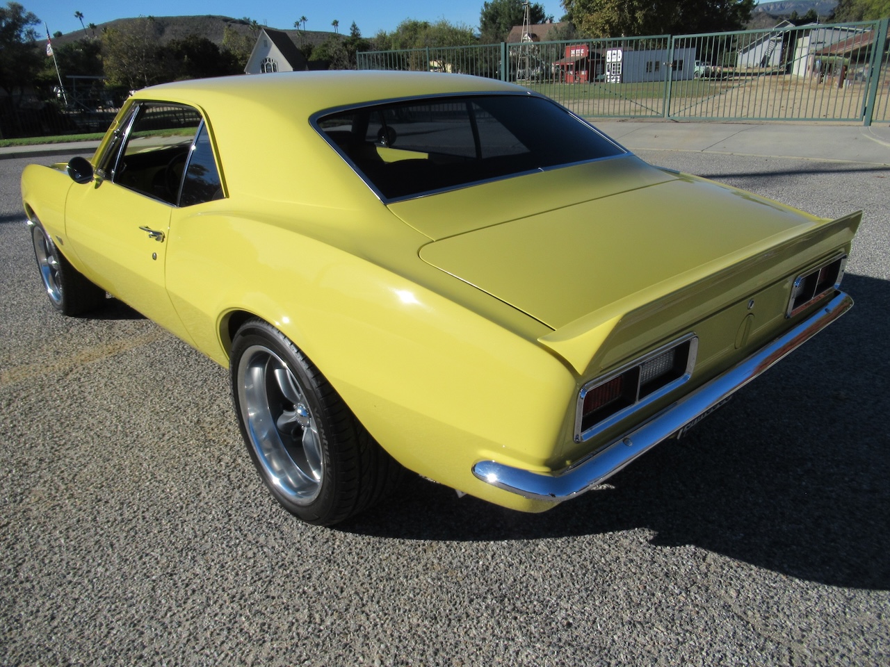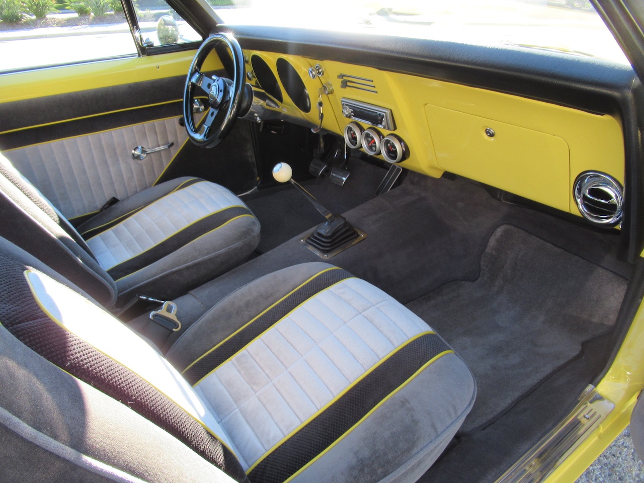This is a nicely restored Camaro with a few tasteful modifications. It had a bare metal high quality re-spray in Daytona Yellow and is laser straight with front and rear spoilers, smoothed and detailed firewall, shaved marker lights as well as the addition of 67 doors just because the guy wanted wing windows for that extra ventilation. Other options are dual bowtie side view mirrors, a nice set of 17 and 18 inch staggered cast center 5 spoke Boss Wheels with polished lip wrapped in Hankook performance radial tires and lightly smoked glass. Under the hood sits a very healthy and highly detailed 327 V8 with camel back heads, roller rockers, a polished aluminum intake, Holley dual feed carburetor, Mallory Electronic Ignition, aluminum pulleys, engine dress up kit and Hooker Super Comp headers with performance dual exhaust exiting out the rear. Better hang on when you drop the clutch with that M21 4 speed manual transmission because it likes to go, and the 10 Bolt 3.73 ratio rear differential tries to keep it going straight. The suspension was beefed up to handle the extra power with Z28 coil springs, Multi leaf de-arced rear leaf springs with massive front and rear oversized sway bars, gas shocks and front disc brakes with a dual master. The interior is definitely a product of a 90’s restoration with factory bucket seats finished in comfortable grey two tone cloth with wool carpeting, custom fabricated color matched dash with Auto Meter gauge package, Hurst Quarter stick floor shifter, JVC AM/FM CD stereo, custom steering column, Carbon Fiber Steering wheel and all new modern wiring. This is a very nice and solid car with a stack of receipts dating back over 30 years!