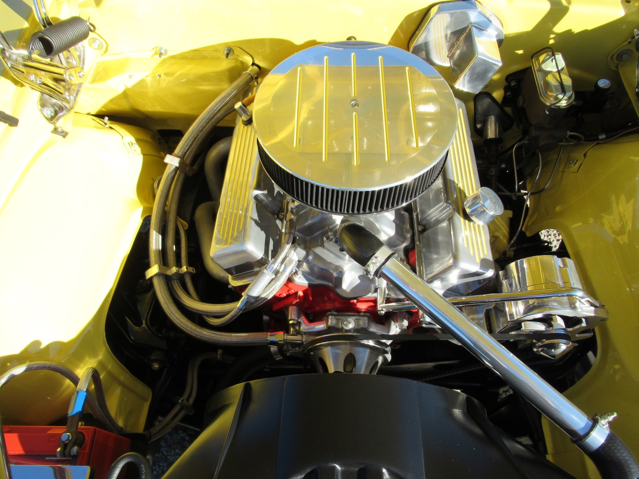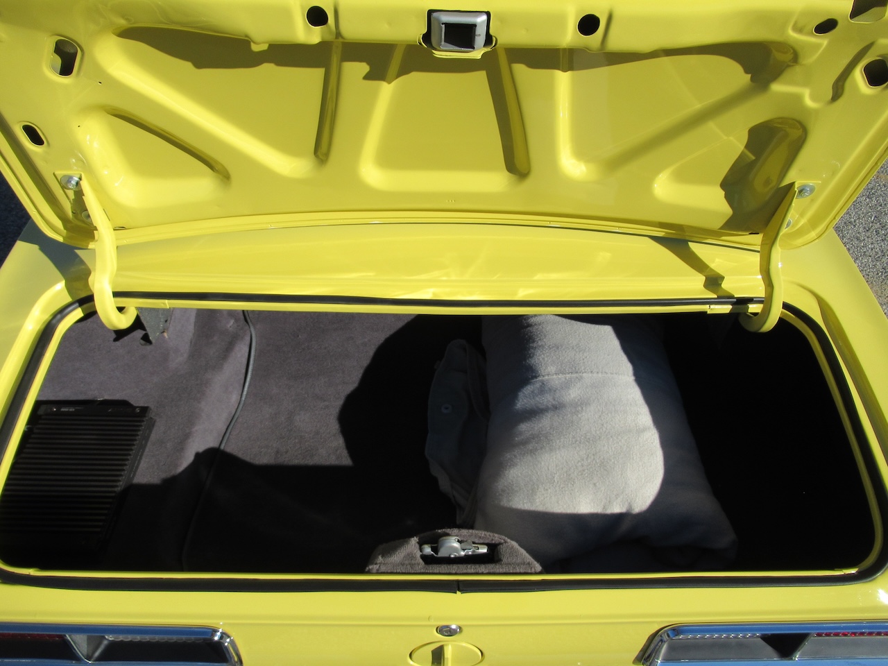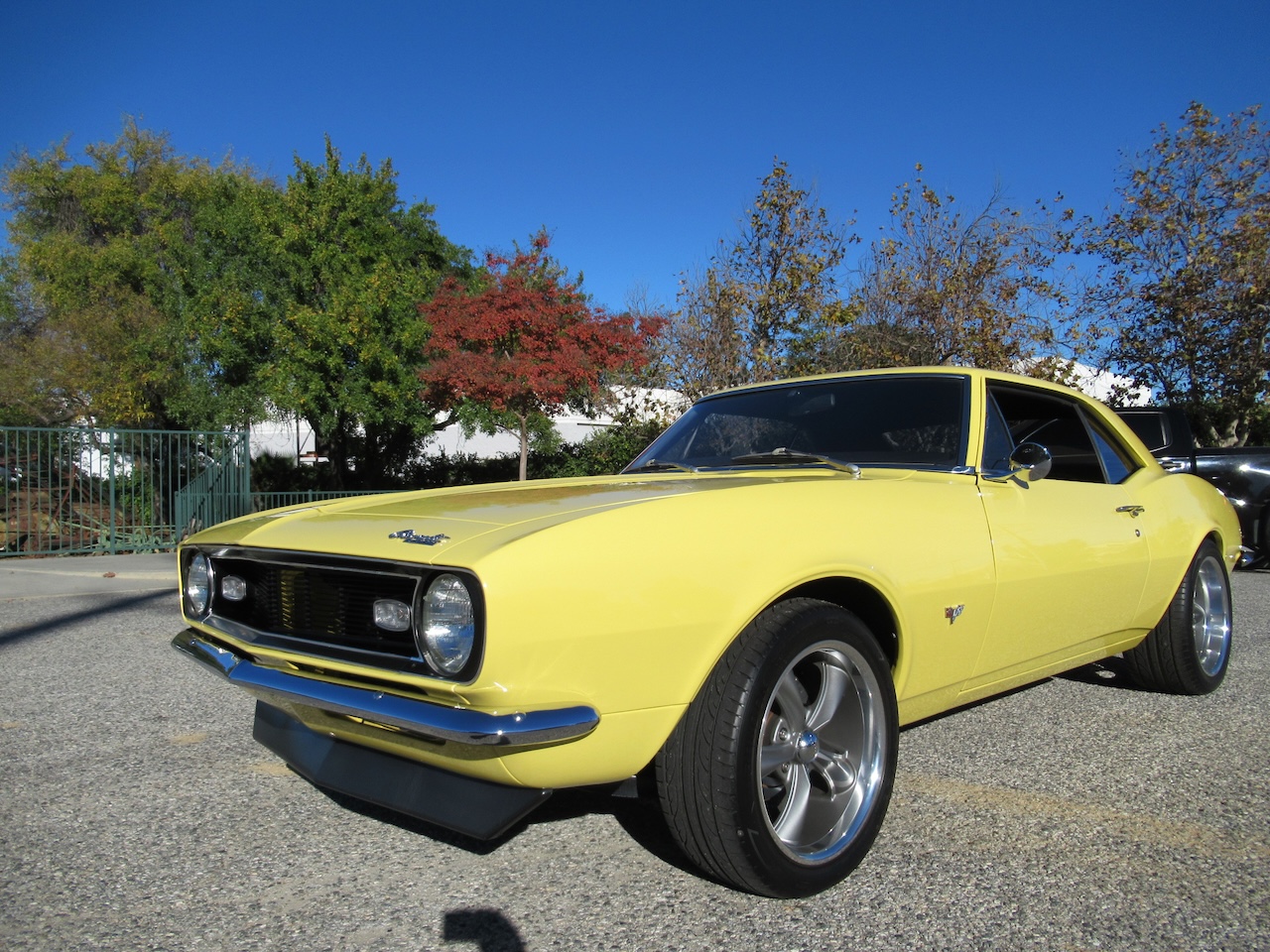 This is a nicely restored Camaro with a few tasteful modifications. It had a bare metal high quality re-spray in Daytona Yellow and is laser straight with front and rear spoilers, smoothed and detailed firewall, shaved marker lights as well as the addition of 67 doors just because the guy wanted wing windows for that extra ventilation. Other options are dual bowtie side view mirrors, a nice set of 17 and 18 inch staggered cast center 5 spoke Boss Wheels with polished lip wrapped in Hankook performance radial tires and lightly smoked glass. Under the hood sits a very healthy and highly detailed 327 V8 with camel back heads, roller rockers, a polished aluminum intake, Holley dual feed carburetor, Mallory Electronic Ignition, aluminum pulleys, engine dress up kit and Hooker Super Comp headers with performance dual exhaust exiting out the rear. Better hang on when you drop the clutch with that M21 4 speed manual transmission because it likes to go, and the 10 Bolt 3.73 ratio rear differential tries to keep it going straight. The suspension was beefed up to handle the extra power with Z28 coil springs, Multi leaf de-arced rear leaf springs with massive front and rear oversized sway bars, gas shocks and front disc brakes with a dual master. The interior is definitely a product of a 90’s restoration with factory bucket seats finished in comfortable grey two tone cloth with wool carpeting, custom fabricated color matched dash with Auto Meter gauge package, Hurst Quarter stick floor shifter, JVC AM/FM CD stereo, custom steering column, Carbon Fiber Steering wheel and all new modern wiring. This is a very nice and solid car with a stack of receipts dating back over 30 years!