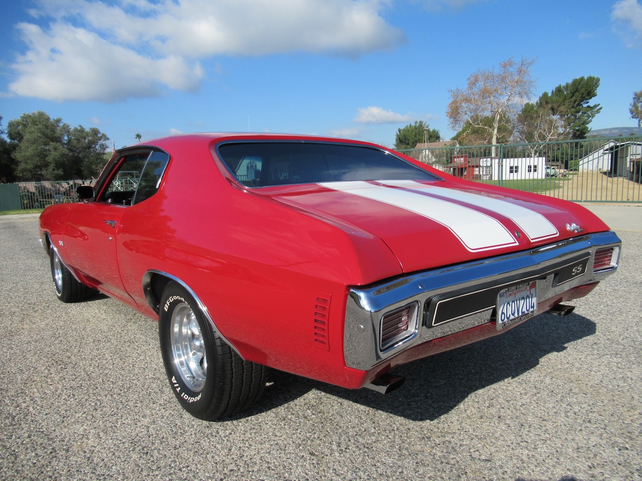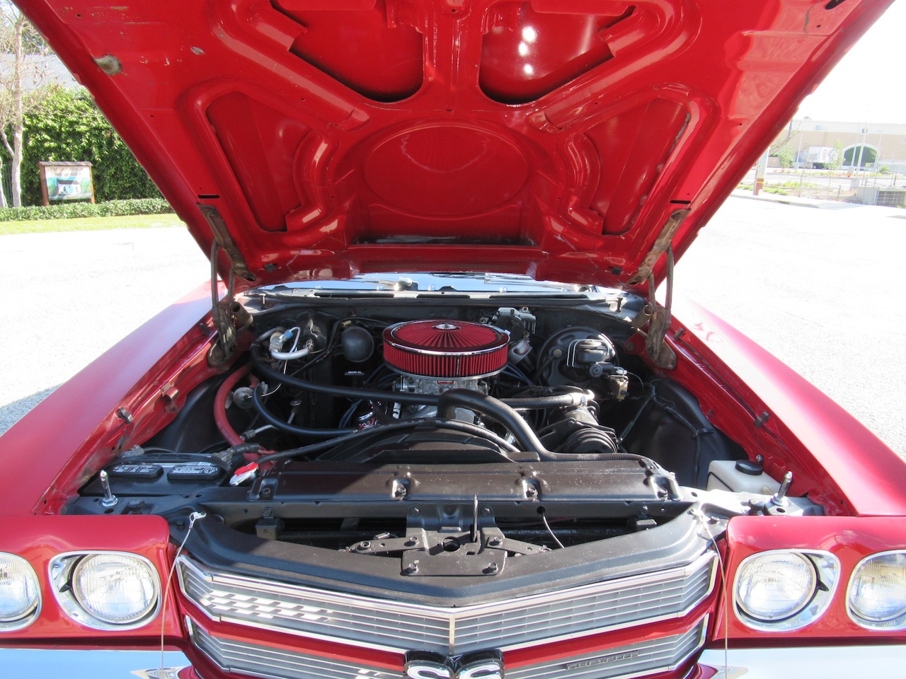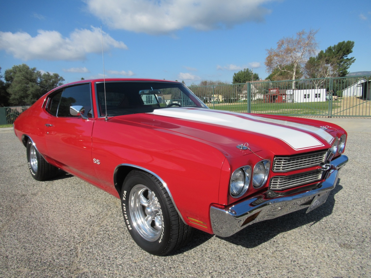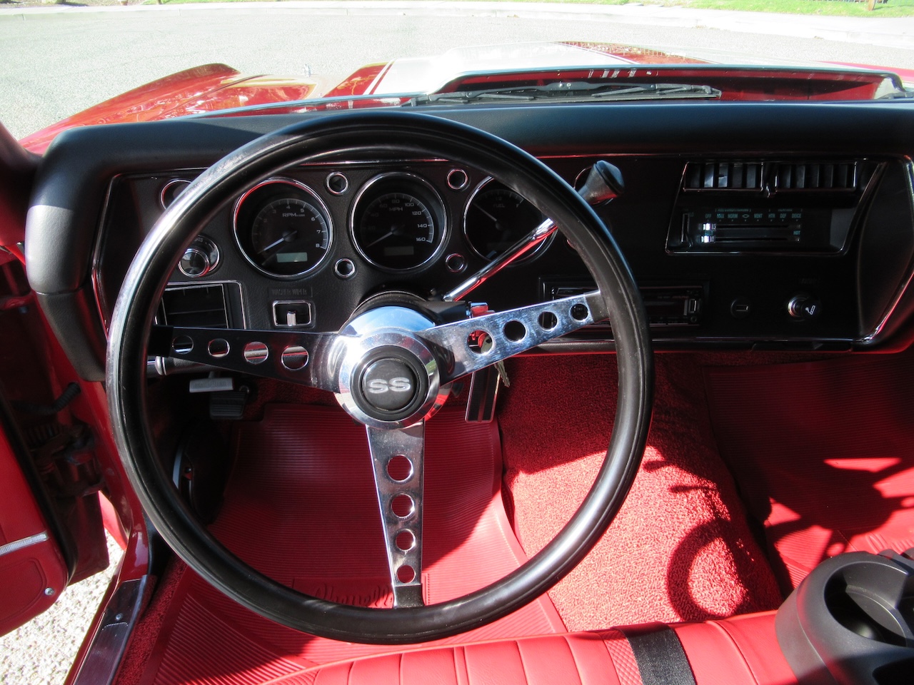 Check out this Cranberry Red Chevelle with a pair of White SS Stripes, Cowl Induction hood, New Chrome SS Bumpers, dual mirrors, tinted glass and a set of 15 inch polished American Racing Wheels wrapped in B.F. Goodrich Raised White Letter radials. Under the hood sits a 350/330 HP GM crate motor with chrome GM Valve covers, polished Edelbrock aluminum intake, Edelbrock 4 barrel carburetor, HEI ignition, Factory A/C with R134 conversion, power disc brakes, power steering, headers with dual exhaust and performance mufflers with some correct Chrome tips exiting out the rear. Power gets put to the road through a 700R4 4 speed automatic overdrive transmission followed by a freeway friendly 12 Bolt rear differential, front and rear sway bars and some upgraded tubular control arms up front to help with the handling. The Red vinyl interior is very nice with new Legendary Upholstery on the original bench seat, SS door panels, Dakota Digital gauge package in an SS style dash cluster, tilt steering column with custom 3 spoke steering wheel, Alpine AM/FM CD stereo with Bluetooth connectivity, kick panel speakers and a USB port for charging your devices. 1970 seems to be the most popular and noticed years of the Chevelle and prices seem to be soaring. Although this is not a restored show car it sure is much more affordable and just as much fun to drive!