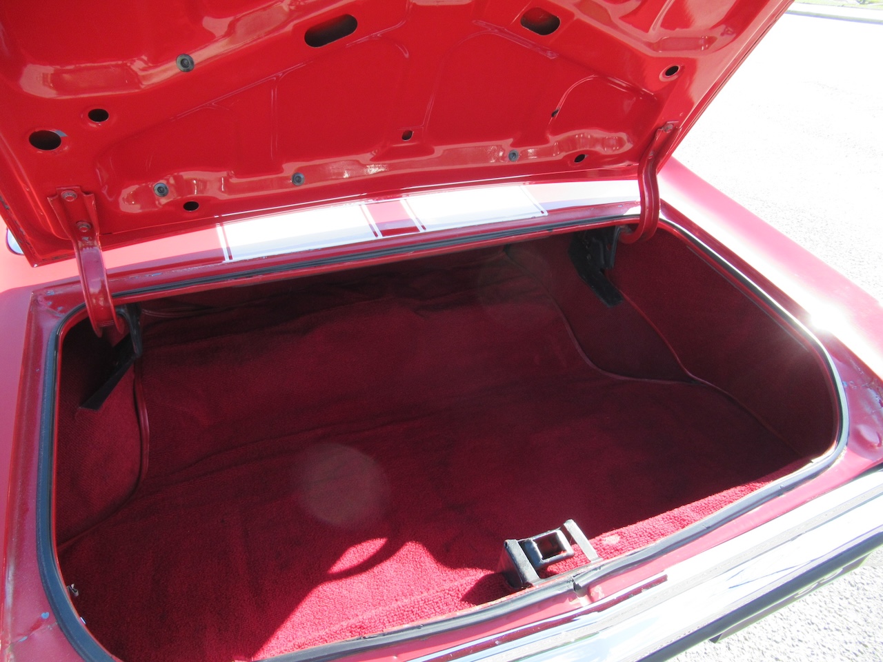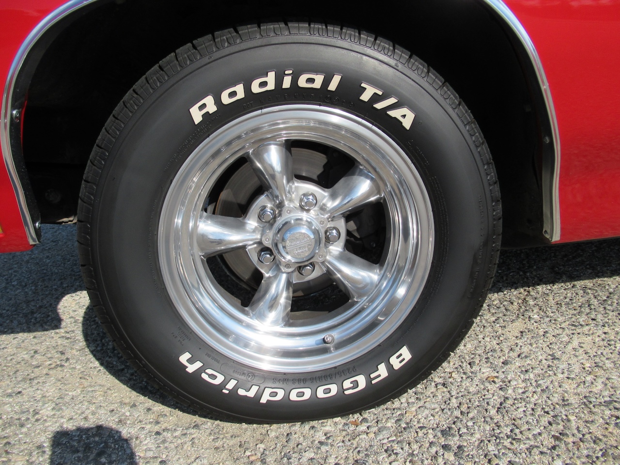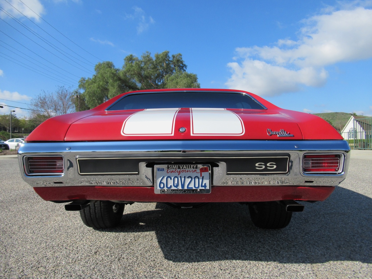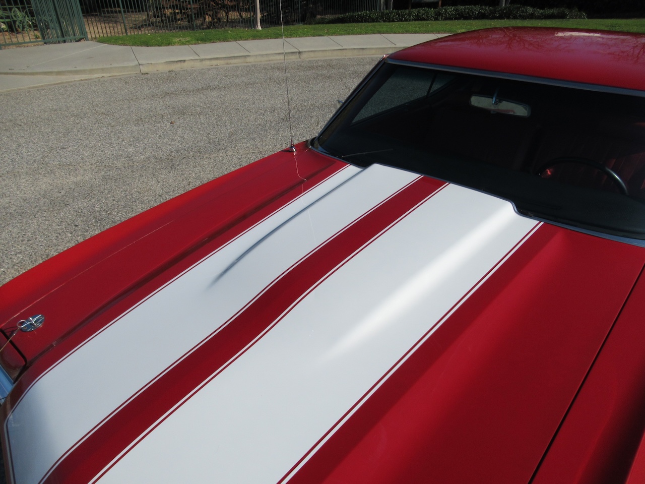 Check out this Cranberry Red Chevelle with a pair of White SS Stripes, Cowl Induction hood, New Chrome SS Bumpers, dual mirrors, tinted glass and a set of 15 inch polished American Racing Wheels wrapped in B.F. Goodrich Raised White Letter radials. Under the hood sits a 350/330 HP GM crate motor with chrome GM Valve covers, polished Edelbrock aluminum intake, Edelbrock 4 barrel carburetor, HEI ignition, Factory A/C with R134 conversion, power disc brakes, power steering, headers with dual exhaust and performance mufflers with some correct Chrome tips exiting out the rear. Power gets put to the road through a 700R4 4 speed automatic overdrive transmission followed by a freeway friendly 12 Bolt rear differential, front and rear sway bars and some upgraded tubular control arms up front to help with the handling. The Red vinyl interior is very nice with new Legendary Upholstery on the original bench seat, SS door panels, Dakota Digital gauge package in an SS style dash cluster, tilt steering column with custom 3 spoke steering wheel, Alpine AM/FM CD stereo with Bluetooth connectivity, kick panel speakers and a USB port for charging your devices. 1970 seems to be the most popular and noticed years of the Chevelle and prices seem to be soaring. Although this is not a restored show car it sure is much more affordable and just as much fun to drive!
