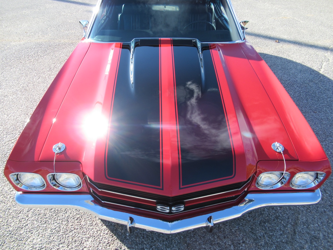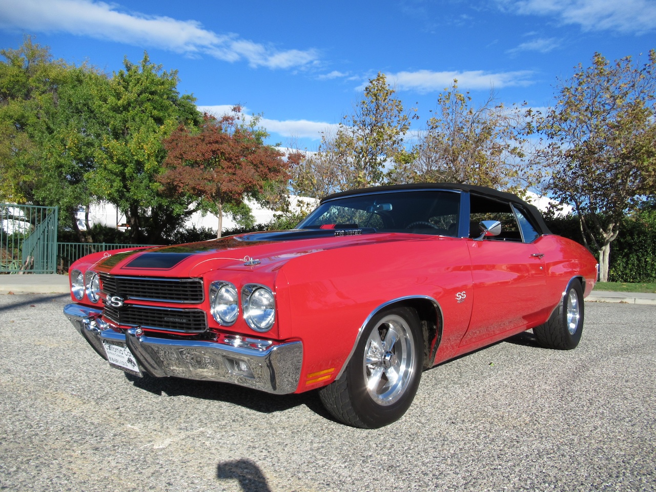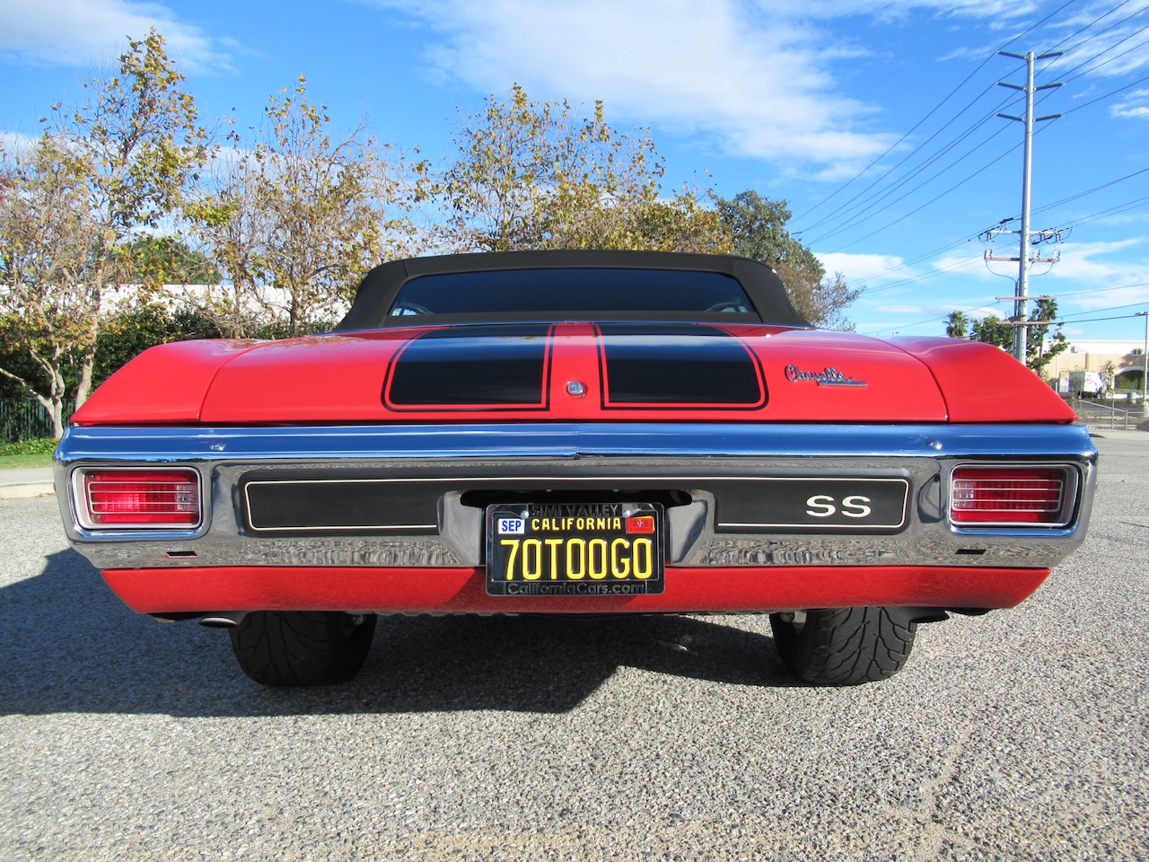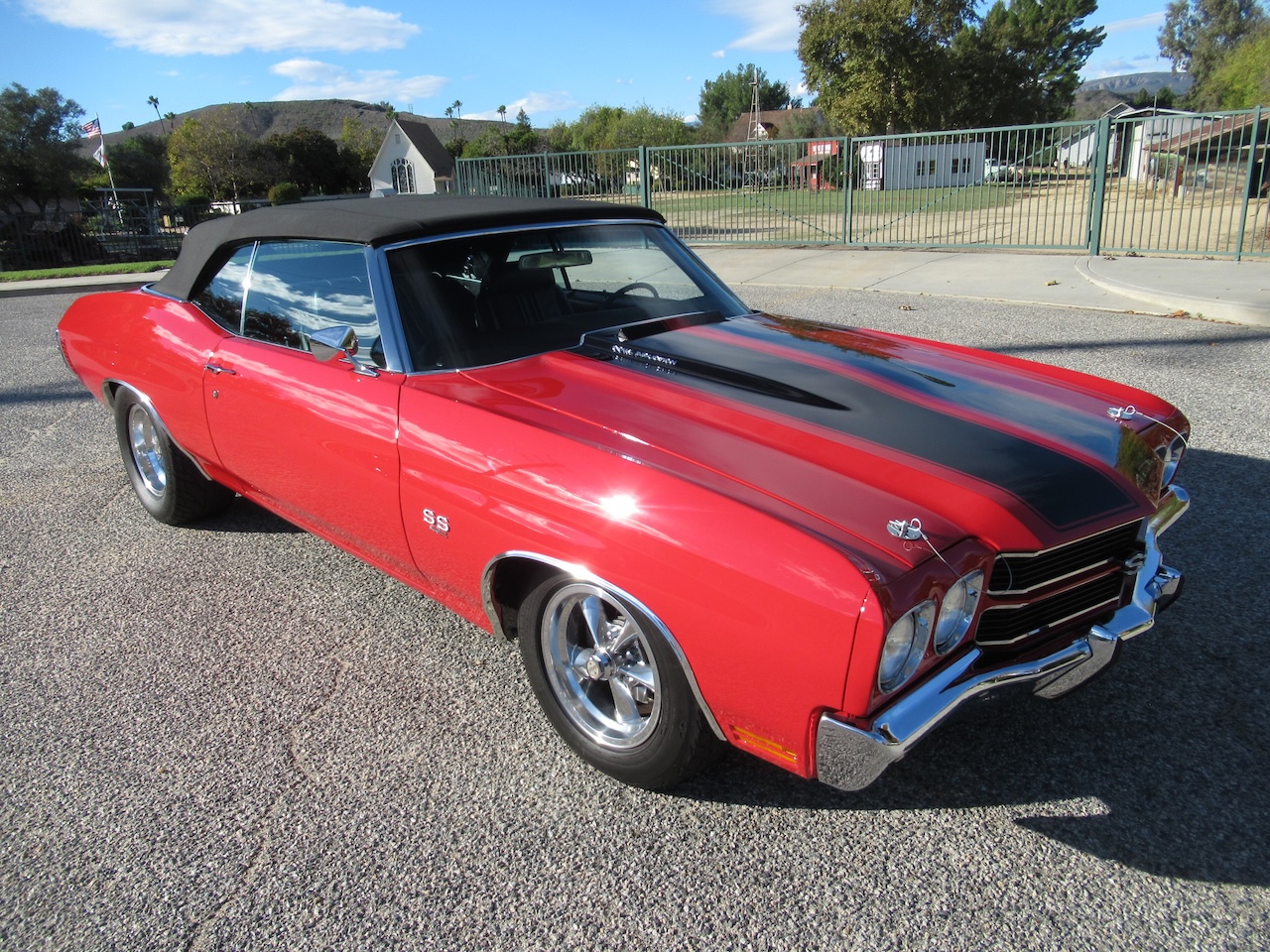 A fresh frame off restored Super Sport drop top! This amazing Convertible Chevelle is finished in Cranberry Red with Black Stripes per the cowl tag, functional cowl induction hood and a Black Stayfast power top with a glass rear window. Chevrolet did not produce many SS Convertibles in 1970 and this one has lots of options and upgrades. Under the hood sits a ZZ502/502 Horsepower GM crate motor (Disguised as a 454) with aluminum heads, Holley double pumper 4 barrel carburetor, MSD Digital E distributor, Black powder coated aluminum radiator, CPP 4 wheel power disc brakes, close ratio power steering, Hedman ceramic coated headers with custom dual exhaust and flanged Flowmaster mufflers. The power gets distributed through a Keisler Engineering 5 Speed manual transmission with a Centerforce Performance clutch, new custom drive shaft followed by a 12 Bolt Posi-Traction rear differential with a 3.73 gear ratio. The suspension consist of Global West upper and lower control arms with dropped spindles, front and rear oversized sway bars, rear Global west suspension with KYB gas shocks on all 4 corners all sitting on a rare set of 15 inch staggered T70 polished American Racing wheels wrapped in some Mickey Thompson Street/Strip radials for an awesome Classic Muscle car look. The completely new interior does not disappoint with Black vinyl bucket seats finished in new Legendary upholstery with barely noticeable larger bolsters, new correct carpeting, center console with Muncie floor shifter, power windows, power locks, Full gauge package with tachometer, added under dash oil pressure gauge, factory tilt steering column with 3 spoke GM comfort grip steering wheel and Custom Auto Sound Stereo. The massive amount of powder coating, plating and man hours truly shows in this car and it is ready to cruise the highways and start collecting trophies!