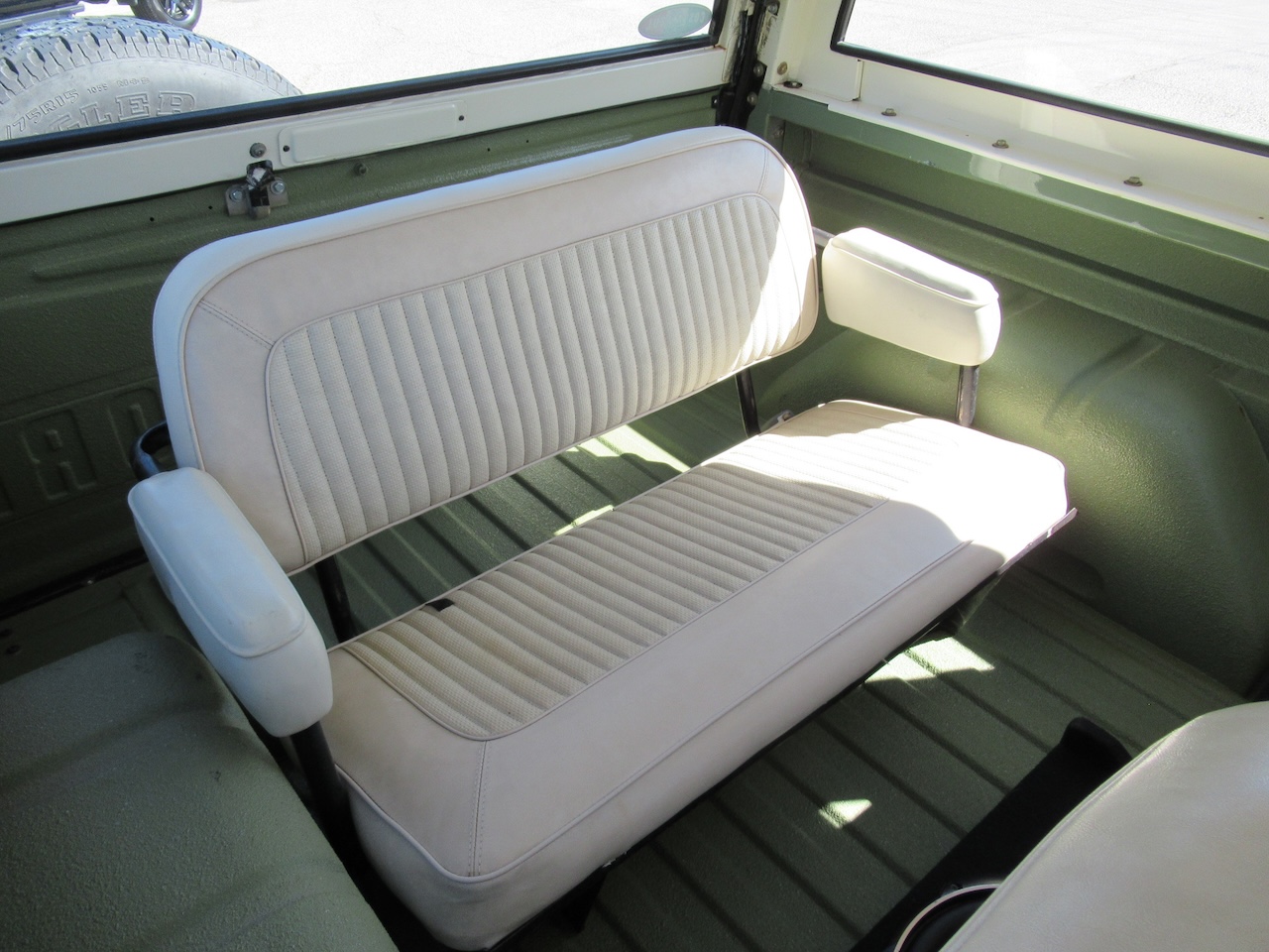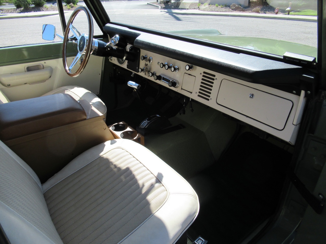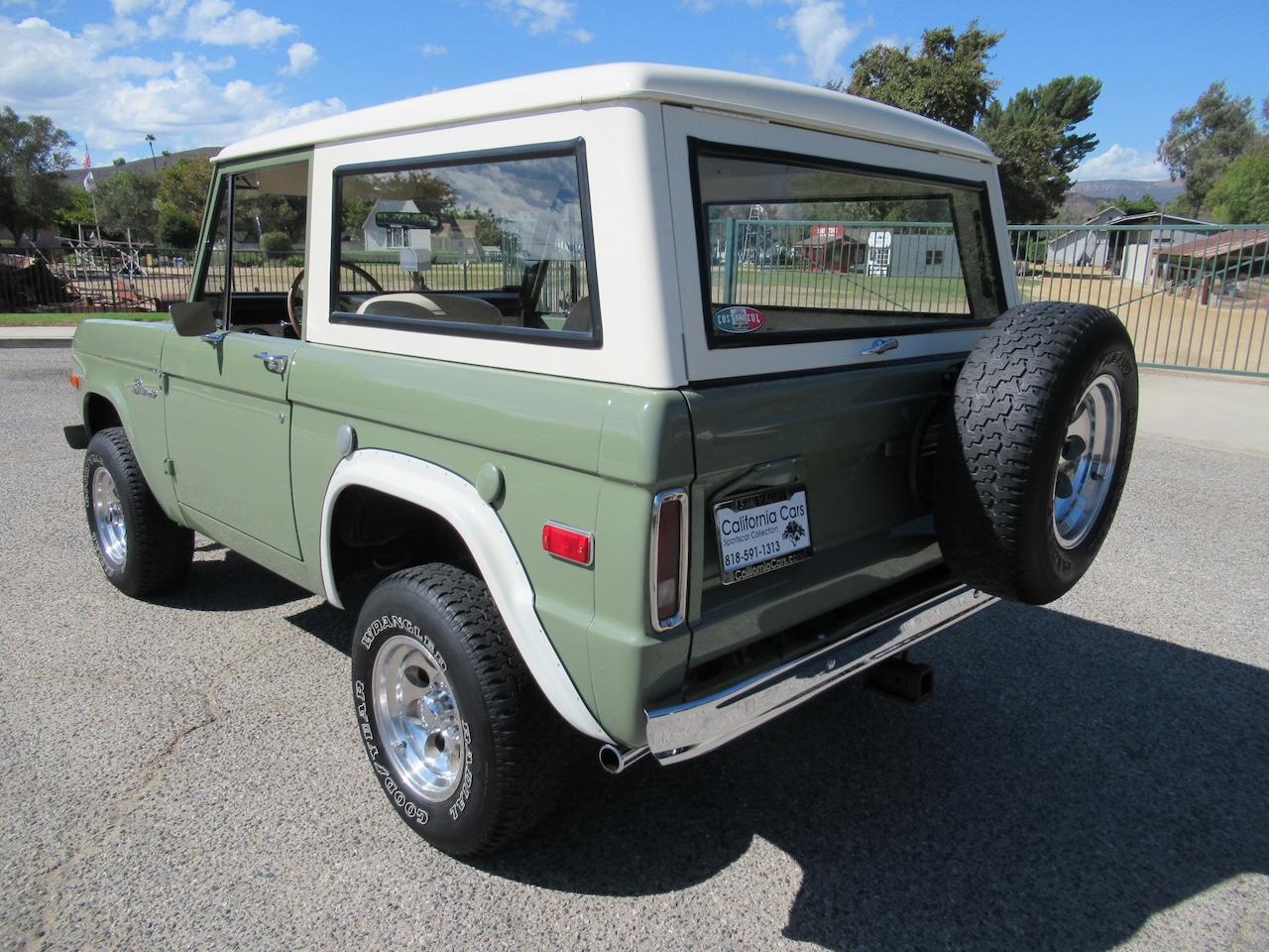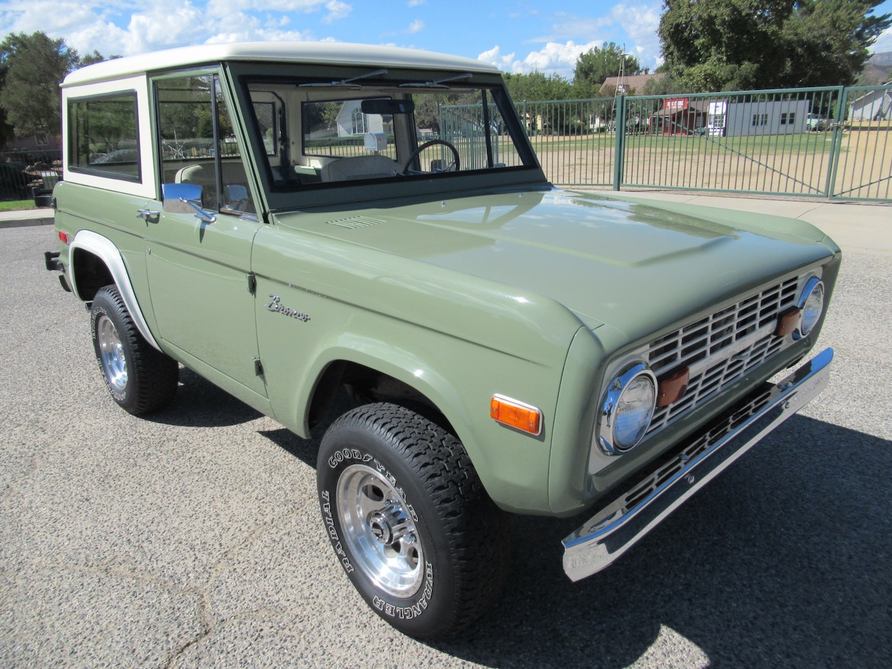 A clean little Bronco that won’t break the bank! This super straight Bronco is finished in Boxwood Green with a White removable hardtop, upgraded hood and hatch lift shocks, nice Chrome bumpers and trim, tow package, dual fuel tanks, spare tire carrier and a set of 15 inch Ultra Aluminum alloys with Goodyear raised white letter radials. The 302 V8 runs great and has an upgraded Edelbrock aluminum intake manifold with matched Edelbrock 4 barrel carburetor, Aluminum radiator, dual exhaust with Turbo mufflers, power steering and front power disc brakes. The 3 speed on the column manual transmission shifts great along with the transfer case, Warn locking hubs and 3.50 differential ratio. It also comes with a special adapter for flat towing behind a Motorhome which was it’s purpose with the last owner. The interior is original and finished in Parchment vinyl with rear matching seat, custom polished 3 spoke steering wheel with wood finish, Custom Auto Sound stereo with Bluetooth connectivity, amplifier and sub woofer box. The inside floors are coated with a cool Green colored Rhino liner finish for rust protection and durability. This is a very nice Bronco that is ready for some weekend fun!