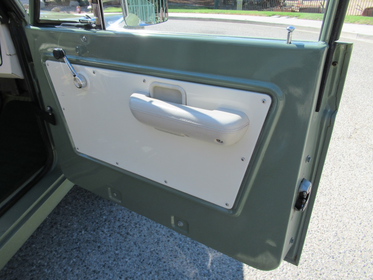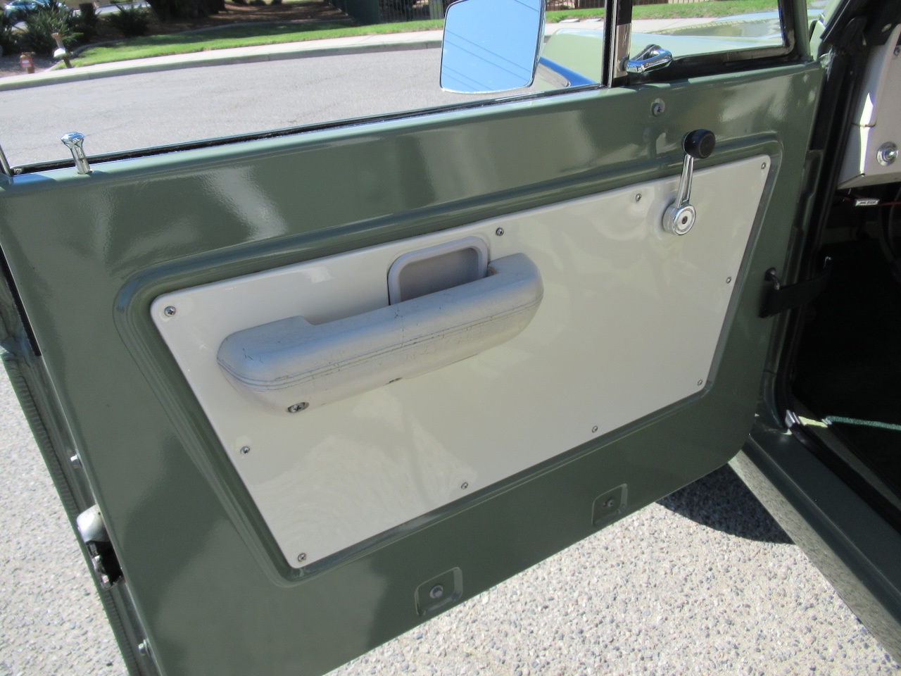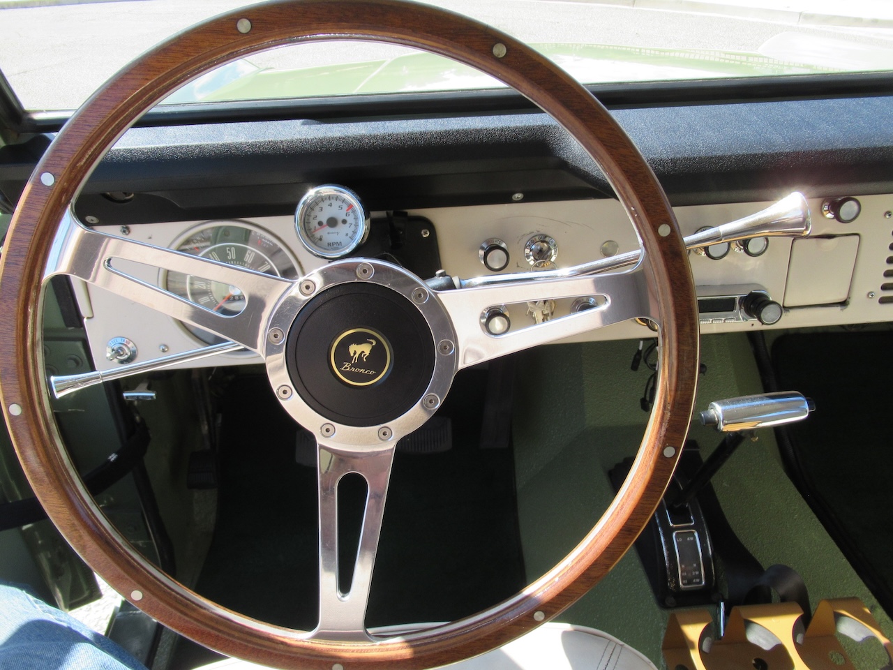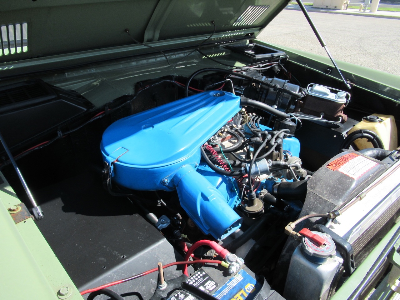 A clean little Bronco that won’t break the bank! This super straight Bronco is finished in Boxwood Green with a White removable hardtop, upgraded hood and hatch lift shocks, nice Chrome bumpers and trim, tow package, dual fuel tanks, spare tire carrier and a set of 15 inch Ultra Aluminum alloys with Goodyear raised white letter radials. The 302 V8 runs great and has an upgraded Edelbrock aluminum intake manifold with matched Edelbrock 4 barrel carburetor, Aluminum radiator, dual exhaust with Turbo mufflers, power steering and front power disc brakes. The 3 speed on the column manual transmission shifts great along with the transfer case, Warn locking hubs and 3.50 differential ratio. It also comes with a special adapter for flat towing behind a Motorhome which was it’s purpose with the last owner. The interior is original and finished in Parchment vinyl with rear matching seat, custom polished 3 spoke steering wheel with wood finish, Custom Auto Sound stereo with Bluetooth connectivity, amplifier and sub woofer box. The inside floors are coated with a cool Green colored Rhino liner finish for rust protection and durability. This is a very nice Bronco that is ready for some weekend fun!